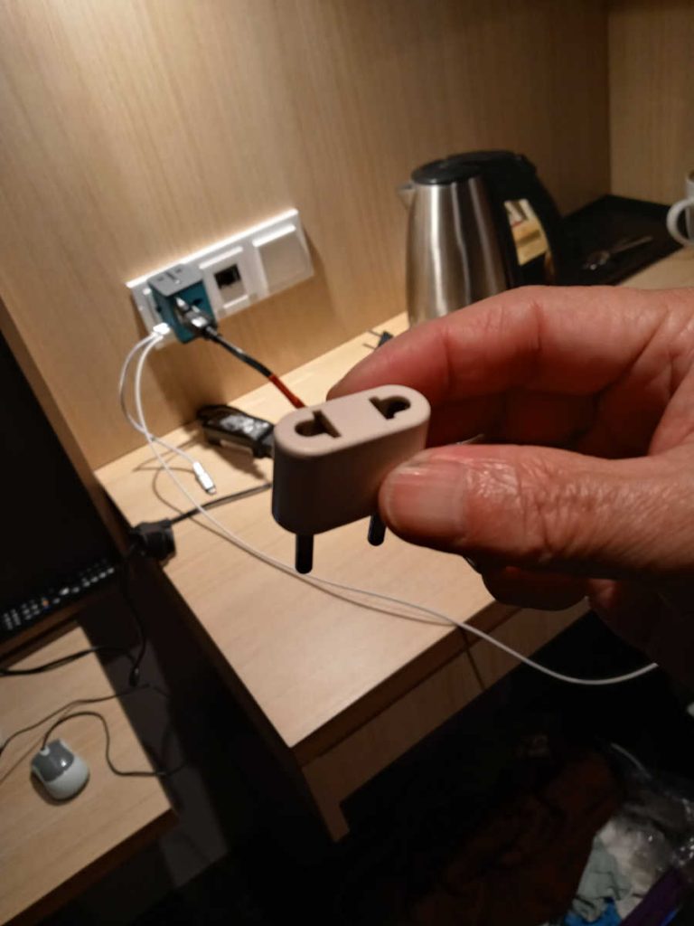 This little guy, 50ยข if bought in the USA, adapts a USA plug to Euro. Or buy it in Iceland for $20. Universal charger brick in the background.