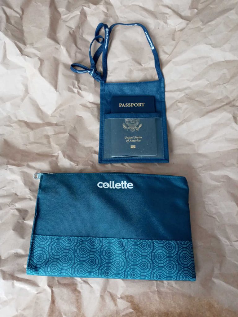 The holder at the top is perfect for holding a passport and ticket. I got it from a cruise in the past. It’s much easierto have this around my neck than rummage around in my day pack (personal item) for ID and ticket, while managing a carry-on, at every security checkpoint, baggage check, passport control and gate. The Clutch below, given to us b Nonstop Travel, is too clumsy to use for this purpose.