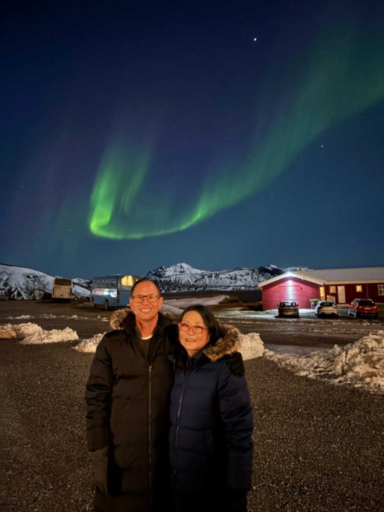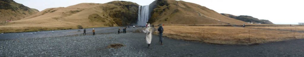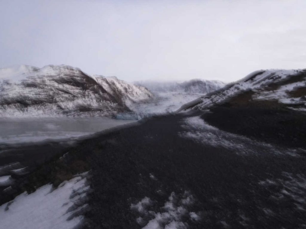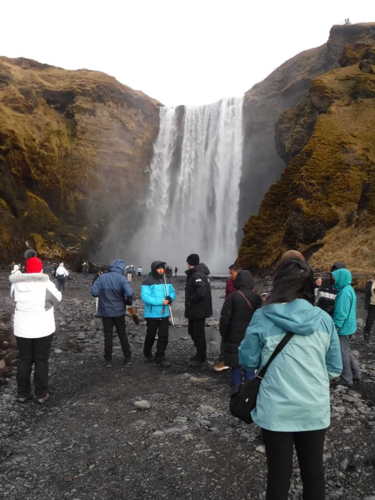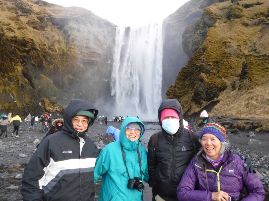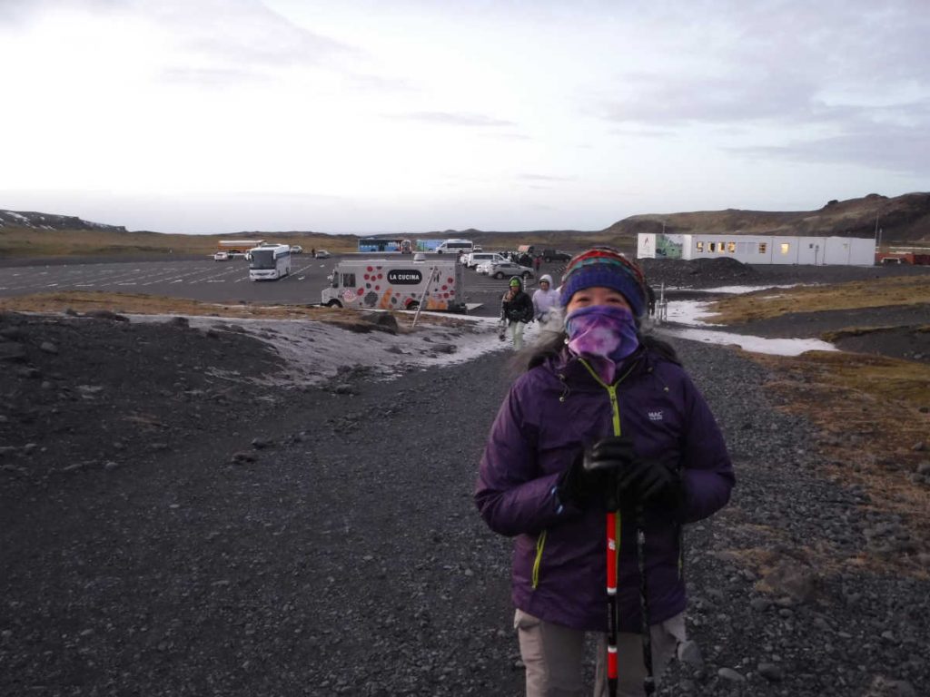Started before sunrise, headed for the lookout point.That’s as close as Merrianne and I got to the glacier. Out of an abundance of caution, we turned around. Others in the group made it to the lookout point beyond the curve ahead.Back at the parking lot, the sun is coming up. Notice that even in this season, there’s a food truck to cater to tourists.Our next stop was Skogafoss Falls. On the right is a trail with 256 steps that II got to hike. I’d say it’s equivalent to about 1/4 of the Koko Head stairs. However, it was cold, about 0 ℃, so no heat load to worry about.At the bottom. I’m using a plain surgical mask to keep my face warm.