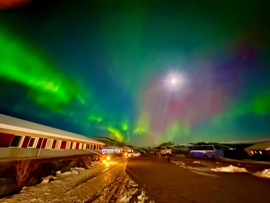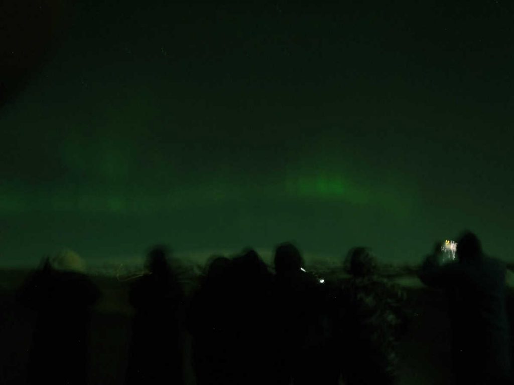 I decided that I didn’t need my jacket, hat, gloves, or pack for dinner, since it was all indoors. Just as we were approaching the dining room, people came running down the hall shouting that the Northern Lights were outside right then. I hurried back to my room to put on my jacket, then saw them. Couldn’t get a picture on my cheap LG phone or Fuji XP80 camera. But I saw it with my eyes. Just faint wisps that look like clouds.