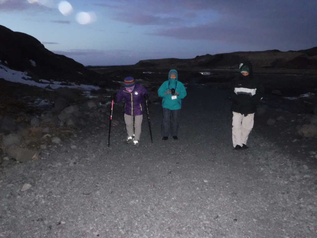 The bus took us to a Glacier in the dim light of dawn. Merrianne was still injured, so we only walked partway. Other groups (not our tour) were going with full climbing gear – helmets, ropes, metal crampons, and a professional guide – to climb onto the actual glacier.