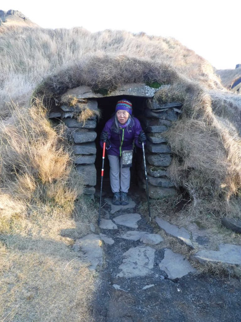 A sod house outside the museum. People still lived in these in the middle of the 20th century.We had lunch at the museum cafeteria. 2 Fish & Chips were 2800 ISK each, and we also had a bowl of sour cabbage soup for 2000 ISK. The soup wasn’t sour, just as Kim Chee soup isn’t spicy unless you add more spice. Probably ithe “sour” just referred to a preservation method, and any sourness leached out when it was boiled.