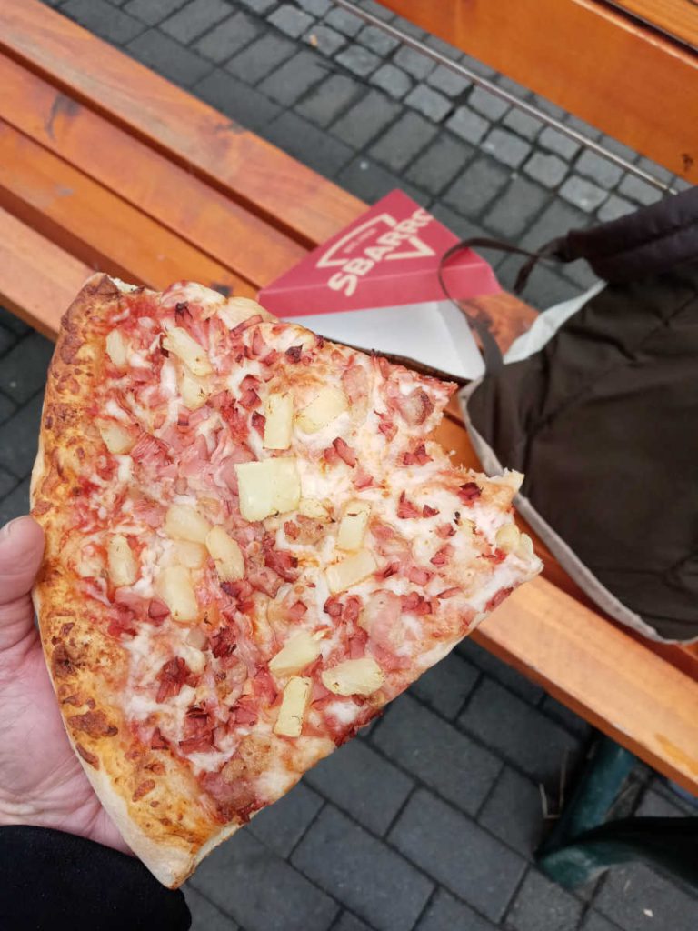 I made it to the 10-11 convenience store and got a slice of Hawaiian Pizza, which turned out to just be Sbarro. Instead of Canadian Bacon (Peameal) or Ham, they put regular bacon, chopped into bits. Decent, but not fantastic. About $10, if I recall correctly.
