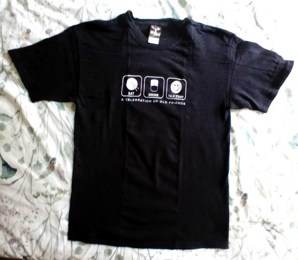 This shirt was designed by a (casual) old friend, Debbie Uchida. We were in band together for Intermediate and High School in Honolulu. She played clarinet. Occasionally, old band friends got together and sometimes I was invited. This shirt was to celebrate those gatherings. It says, “Eat Drink Talk Story”.
