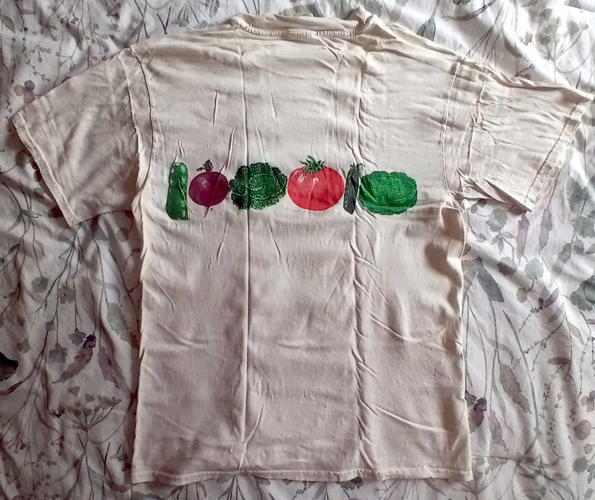 Got this on the 2010 bike tour with Elliot in Vermont, after climbing Bread Loaf, the only significant mountain on the whole trip, which started in Fargo, ND. The Adventure Cycline Northern Tier route was recently changed, to avoid Middlebury Gap in favor of Brandon Gap. The shirt is tearing at the edges of the paint, in the picture of the hills.