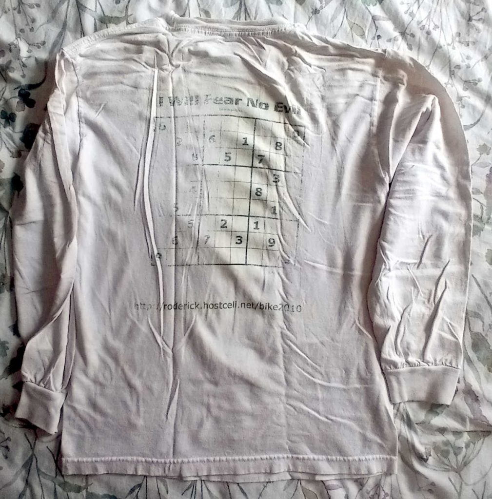 I made this shirt for the Northern Tier bike tour I did with my son, Elliot, in 2010. I wanted a long sleeve shirt for sun and/or cold protection. It says “I WILL FEAR NO EVIL”, a play on Sudoku puzzles for which “Evil” is one of the difficulty levels. I’m still into Sudoku to this day. But how many did I do on the actual trip? Zero. The shirt also has the url of the blog I used at the time. It was on a free host, but when that stopped offering free hosting, I moved the site to pididu.com .