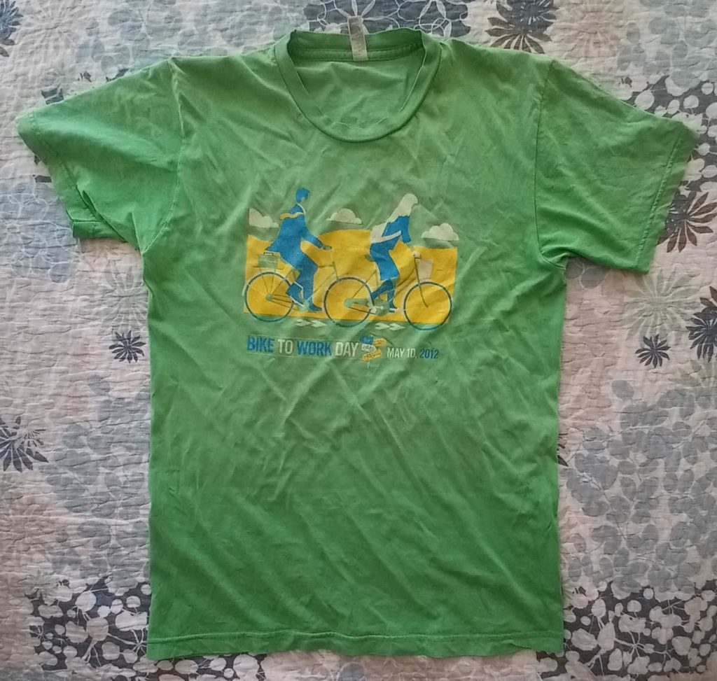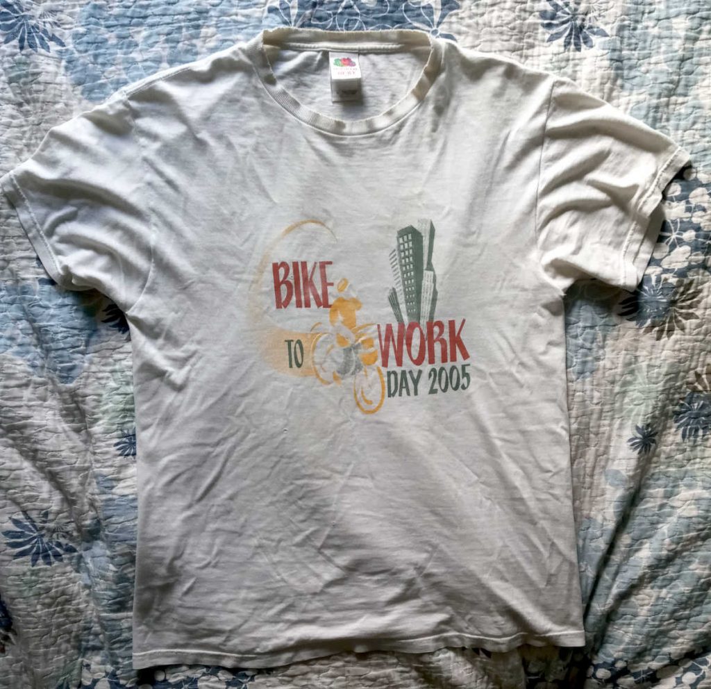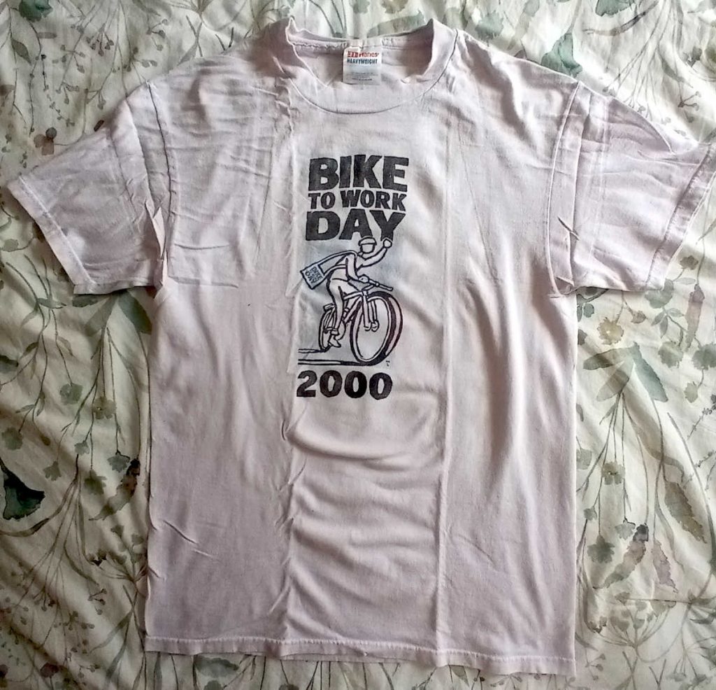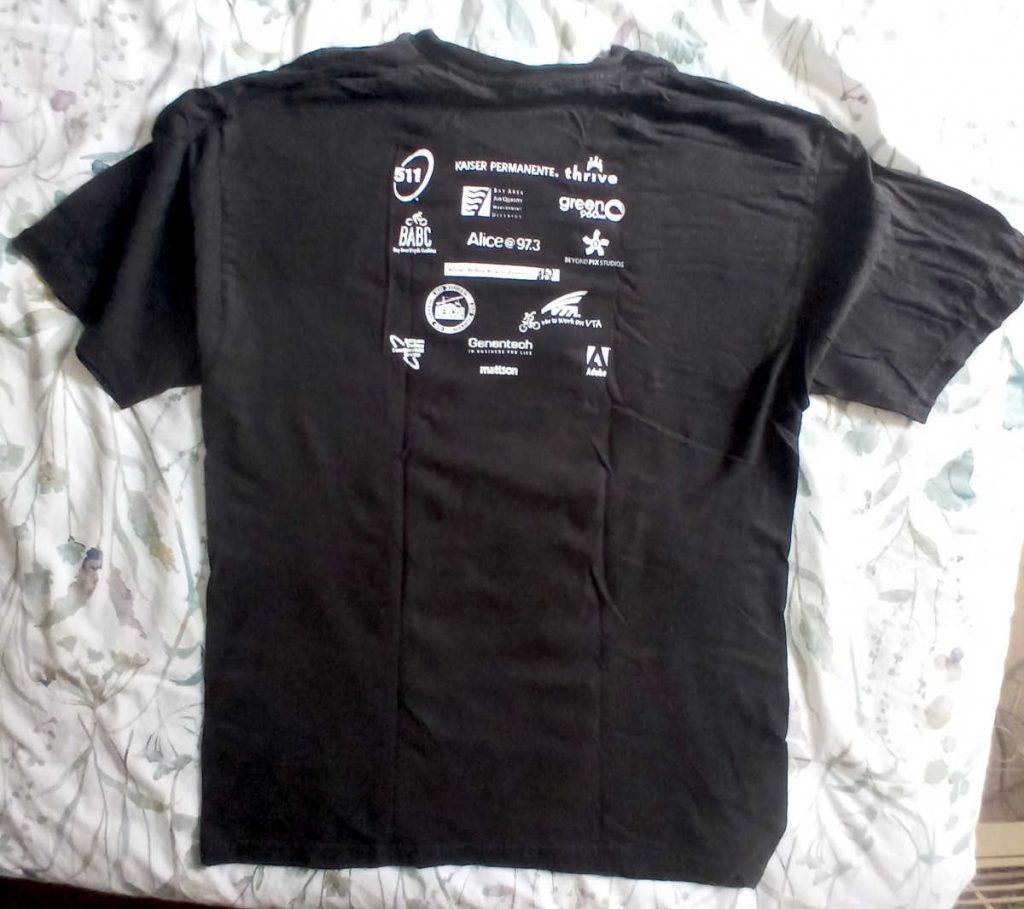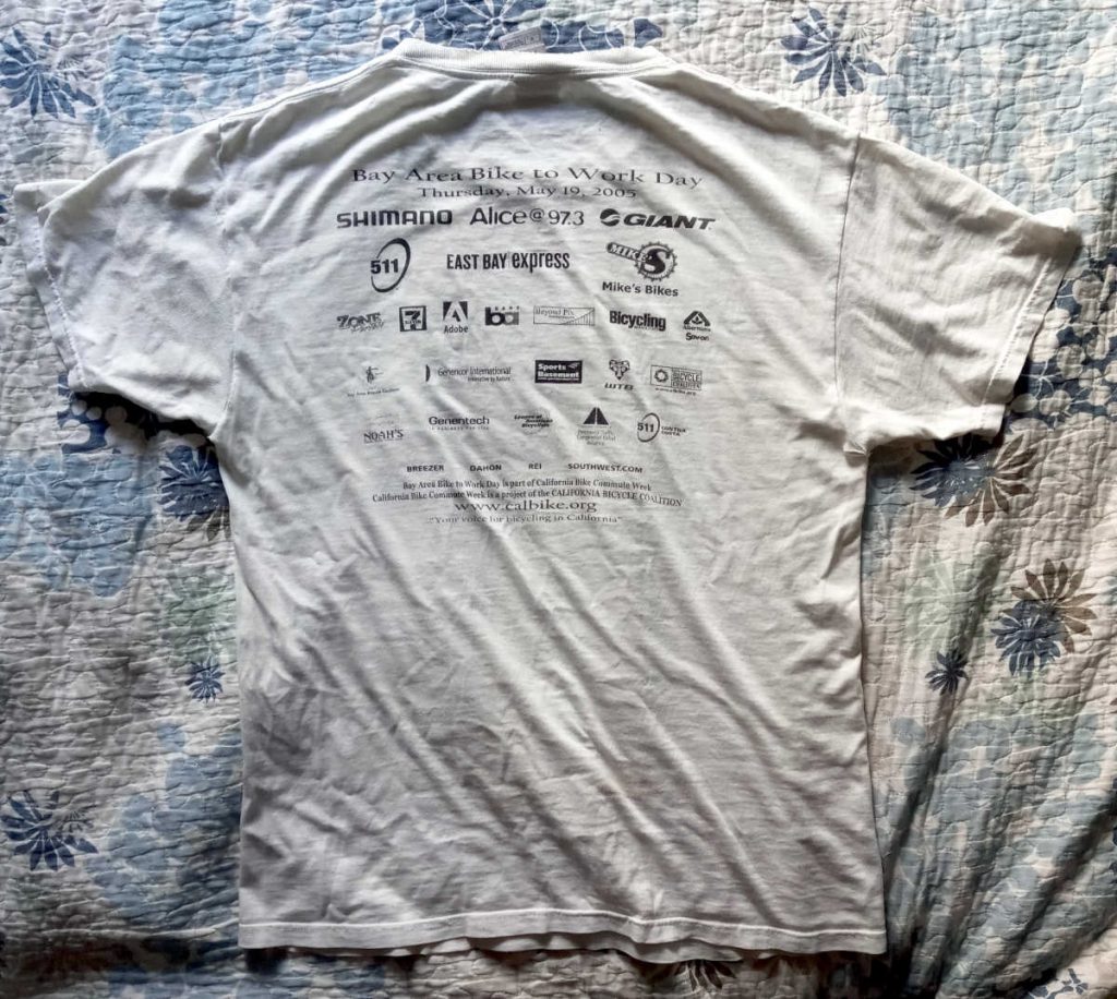 Below are several more Bike to Work Day shirts. HP, where I worked, was once one of the sponsors of the event, but that tapered off in later years. It’s interesting to see the major sponsor lists on the backs of the shirts change over time. I was a volunteer for Bike to Work Day pretty much every year, and actually biked to work for about 25 years. No accidents in all that time, Thank God.