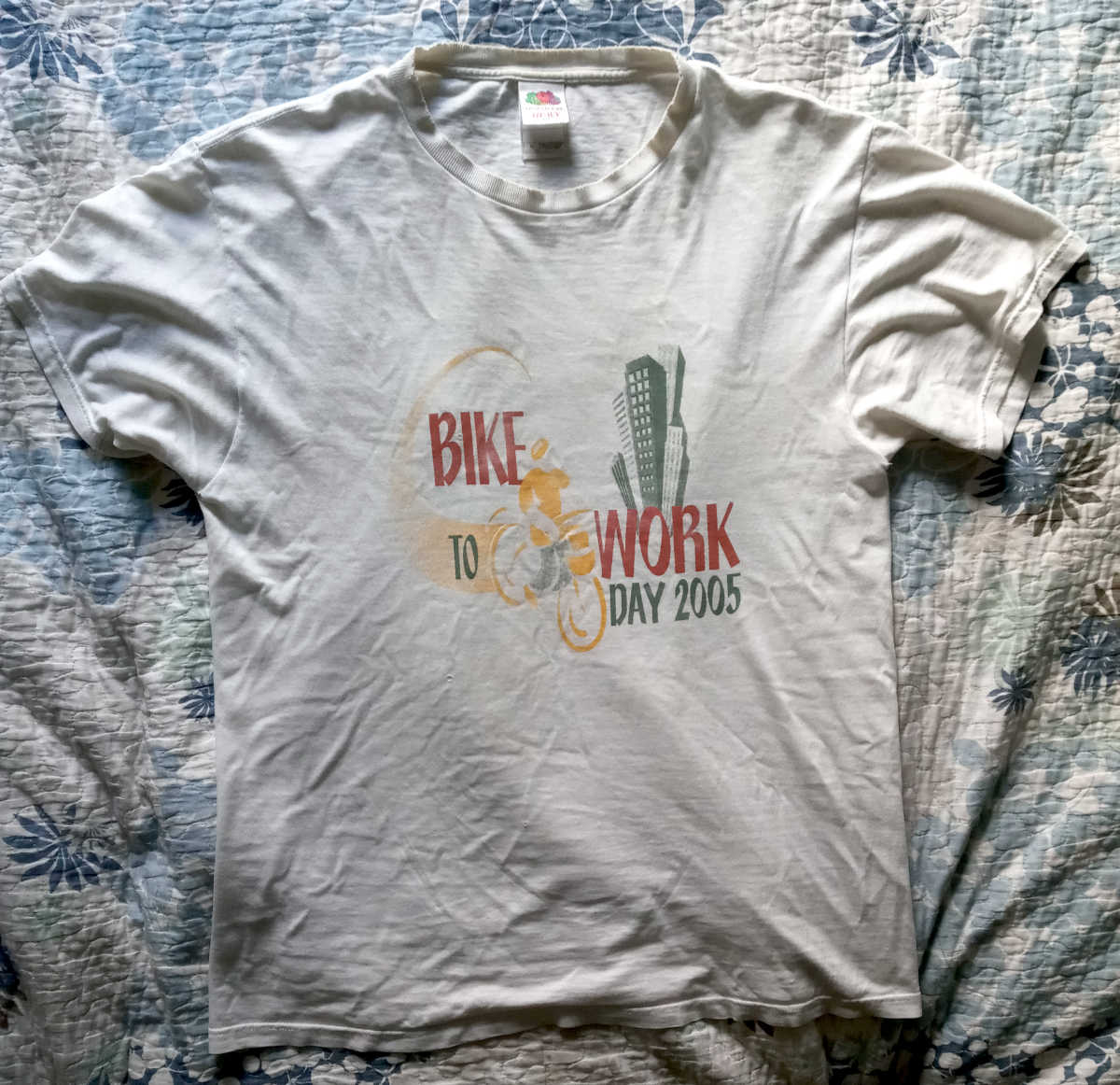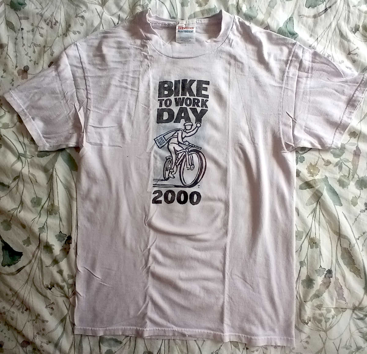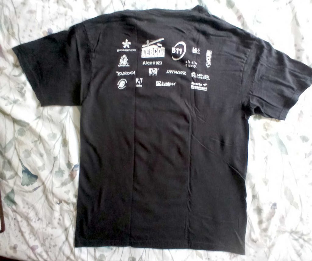 Bike to Work Day, 2002. The shirt would still be okay were it not for the split in the back under the blue logo. I had been volunteering for Bike to Work for many years, starting at a time when Hewlett-Packard was a sponsor. That year, though, was post 9-11, and post Compaq Merger, so HP did very little in the way of sponsorships. I kept up volunteering at every opportunity to keep busy, as formal work was tailing off, and I was being kept on for support of legacy Netservers.