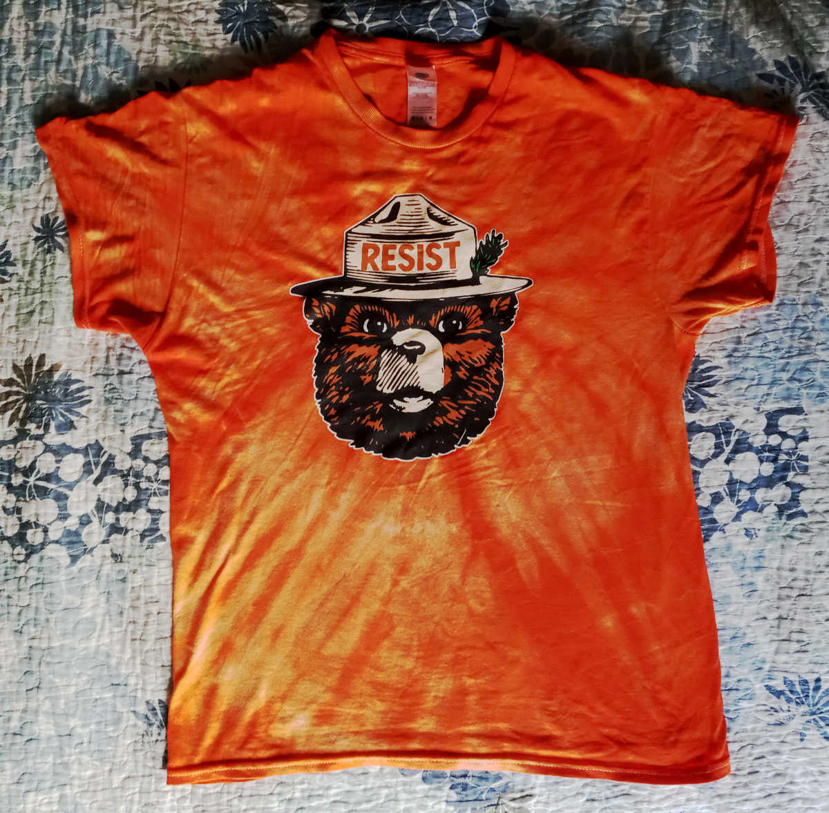 I am not the activist type, and had never attended a protest in my life. That is, until Oct 18, 2025, “No Kings Day.” What I was seeing around me was getting so intolerable, I could no longer remain silent. Bought this tie-die shirt for $20 – Smokey reminding us that Only WE can prevent fascism.