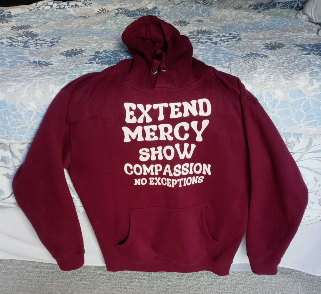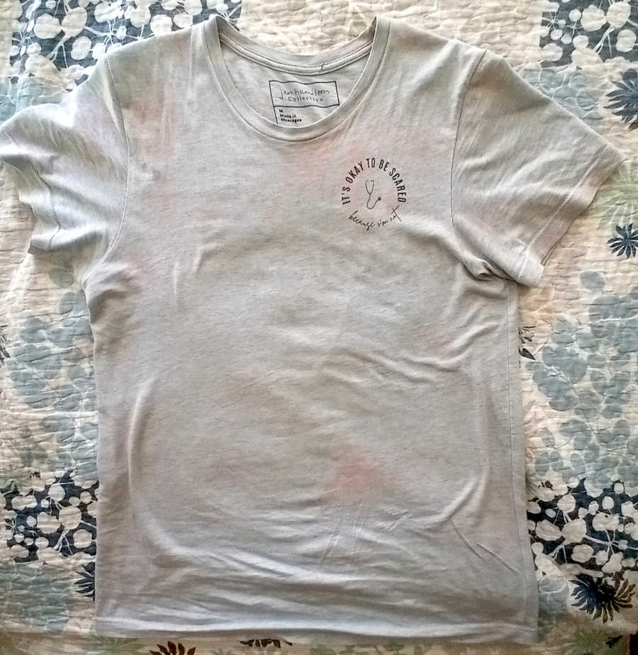 If you look closely, you can make out that this shirt is from Jen Hamilton, too. It says, “It’s okay to be scared, because I’m not.” As an OB nurse, these are her words of reassurance to pregnant and delivering mothers. I apply it more generally to life, though. The orange stains are from a bleeding tie-die shirt that was washed at the same time. Amazingly, it was neither the Resist shirt, nor the Extend Mercy hoodie. It was a shirt that I got from a Thrift Store in (I think) Arizona.